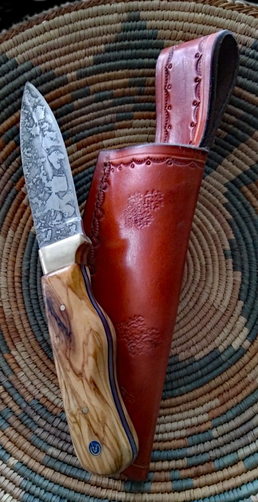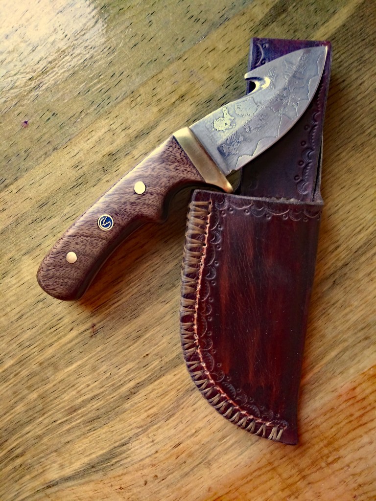 But there is the ‘Just Basic Camp Knife’ and a couple others that are just that. I enjoy making each one because no two are the same. That knife is the ‘Day Tripper’. I’m going to keep making those but my best seller I’m not making any more – I just made the last one. I’ll post pic’s once they are all done and I have the sheaths made for them. This Last One is the last of the PuP series. It is 440C etched with 200 year old American oak and purple heart scales and it comes with one of my hand crafted leather sheath. ANYWAY I’ll post pic’s.