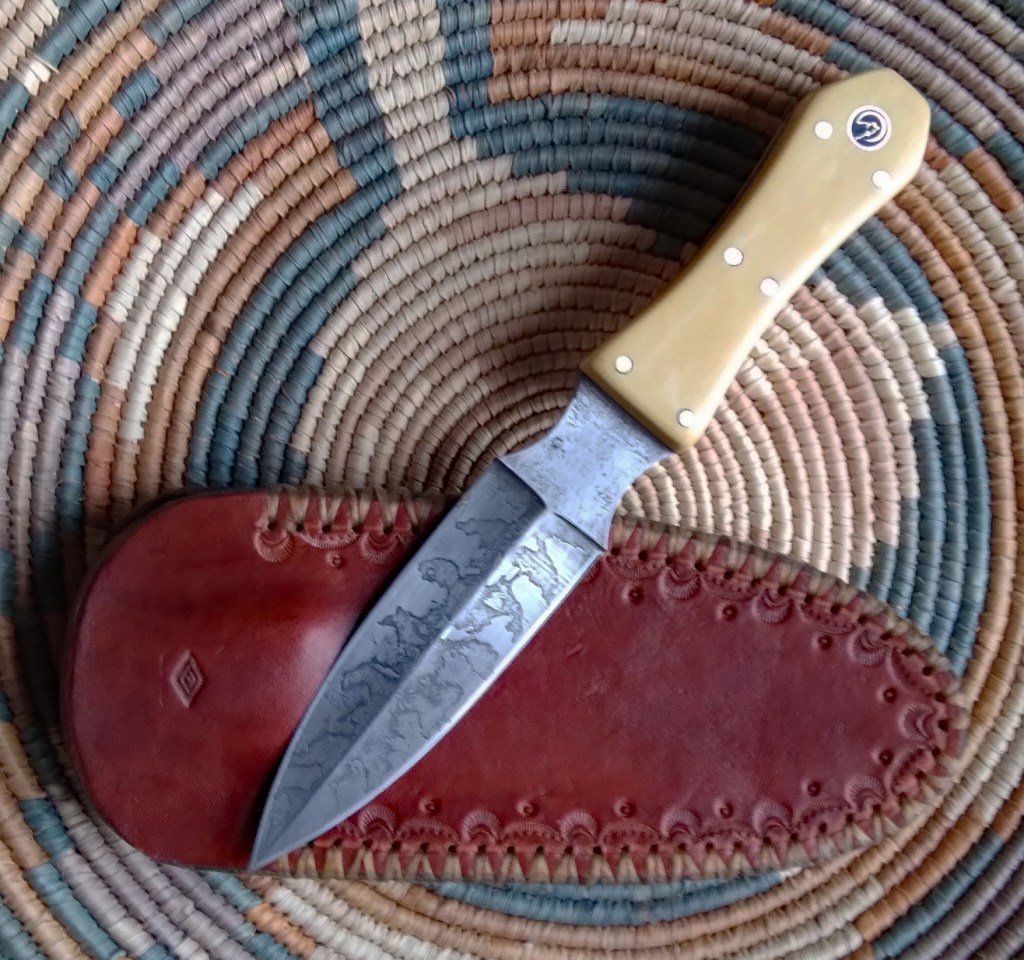 My preferred steel for ‘Art Knives’ is Damascus, however using just that would put the cost of knives out of reach for most people. Damascus is a type of blade material where the steel is heated and folded over and over creating layers. The number of folds can vary from 3 to 2000. Obviously the more folds the more expensive the material and this steel is bought by the precious inch. Damascus comes in many different patterns and types. In an effort to keep my knives affordable and still maintain quality I mainly use 512 fold steel. My preference is a blade with a high carbon center for holding an edge and softer stainless steel layers for strength and flexibility.