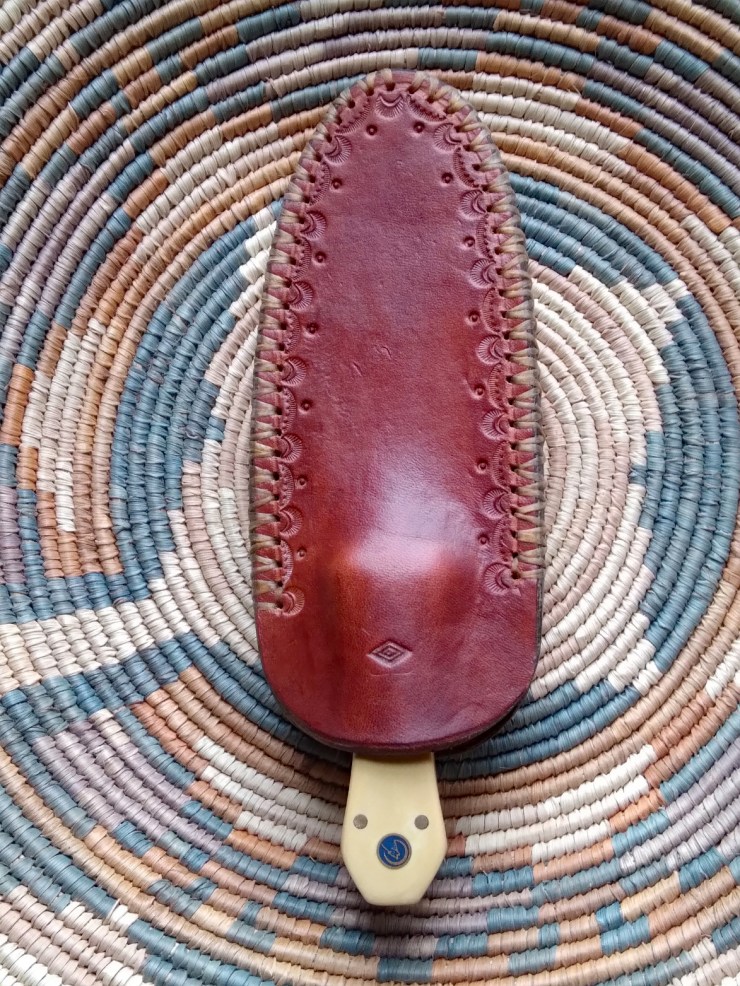Another important aspect of knife making is the sheath. The sheath must not only protect and securely hold the knife; it should accentuate the design of the knife. Compliment and and enhance it’s appeal. The knife maker must once again make a whole series of choices as to the design, materials, color and type of sheath so as to fulfill these requirements.